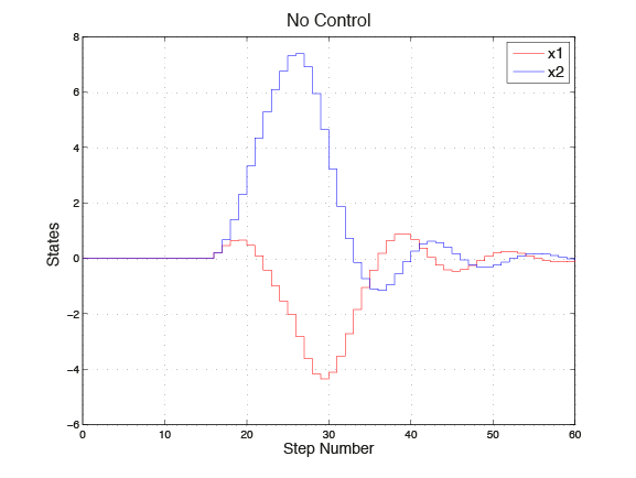 One can see that the disturbance drives the states far away from the desired value. In this example it is shown how FORCESPRO can significantly improve the dynamical behaviour by using the concept of ‘preview’ when such future information is available.